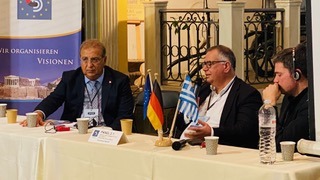 Die erste Paneldiskussion hatte die politische und ökonomische Dimension der deutsch-griechischen Beziehungen zum Gegenstand. Dr. Ronald Meinardus, Senior Research Fellow und Koordinator für Forschungsprojekte zu den deutsch-griechischen Beziehungen bei der Hellenischen Stiftung für Europäische und Auswärtige Politik (ELIAMEP) in Athen, verwies darauf, dass man durch Umfrageerhebungen sehr gut wisse, was Deutsche über Griechenland denken und umgekehrt. Das Griechenlandbild der Deutschen sei sehr positiv. Besonders die Gastfreundschaft, Geschichte und Schönheit Griechenlands würden positiv gesehen.